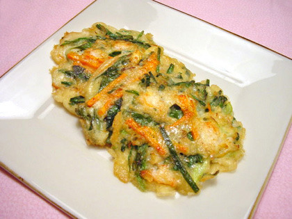 Boo choo jeon (Korean chive with seafood pancake) 1 bunch boo choo (Korean chive) 1/2 onion, thin sliced 1/6 carrot, julienne 1 green chilli, sliced 1/8 cup clam, chopped 2 squids (small one, about 1/8 cup) 4 shrimps (15-20 counts) batter : 1 cup water 1 egg 1/2 cup Korean pancake mix (boo chim ga roo) 3/4 cup Korean frying mix (tui gim ga roo) salt to taste oil to fry cho gan jang (soy sauce with rice vinegar) - 4 tablespoons soy sauce + 2 table spoons rice vinegar) Carefully wash chives, cut into 2 inches. Mix all ingredients in a large bowl. With a whisk, combine batter ingredients. Pour over the vegetables and seafood mixture, mix until all ingredients are well incorporated. In a non stick pan, add 1-2 tablespoons oil, fry until both sides are golden. Serve with cho gan jang (soy sauce with rice vinegar). *Pancake mix and frying mix has a plenty of salt in it, so add more salt after taste it.