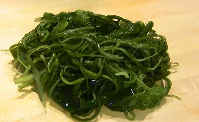 Edible sea vegetable or (“sea plant”) miyeok (미역) is a very healthy food that contains high levels of calcium, iodine, vitamins, and other minerals. It is called “wakame” in Japanese, “qundaicai” in Chinese, and “fougère des mer” in French. In Korean cuisine, it’s usually used for soup or salads.