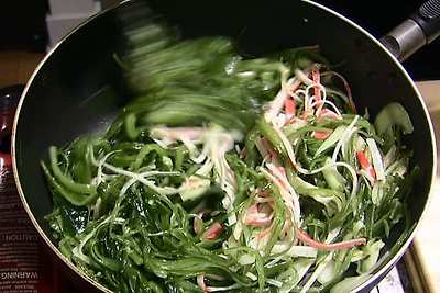 - Add 1 tbs soy sauce, 2 ts mulyeot, and the crabmeat threads. Sautée another minute.