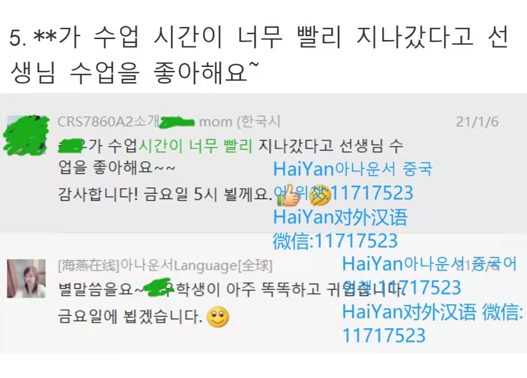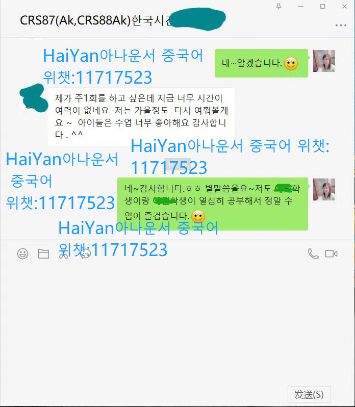 온라인 중국어 1대1 과외 A 교재:汉语口语速成 SHORT-TERM SPOKEN CHINESE{스피킹 위주/일상용어 위주} *입문급(상):109위안/1시간, 1050위안/10시간,2050위안/20시간 , 특가~3000위안/30시간,초특가~5399위안/60시간 , 한정 특가~10199위안/120시간 (남은 수업세트는 1급~4급도 사용 가능하세요. ) *초 급[HSK2]:119위안/1시간, 1150위안/10시간,2250위안/20시간 , 특가~3300위안/30시간 , 초특가~5999위안/60시간 , 한정 특가~11399위안/120시간 (남은 수업세트는 2급~5급도 사용 가능하세요. ) *중급[HSK3]:129위안/1시간, 1250위안/10시간,2450위안/20시간 , 특가~3600위안/30시간,초특가~6599위안/60시간 , 한정 특가~12599위안/120시간 (남은 수업세트는 3급~6급도 사용 가능하세요. ) *중급[HSK4]:139위안/1시간, 1350위안/10시간,2650위안/20시간,특가~3900위안/30시간 ,초특가~7199위안/60시간 (남은 수업세트는 4급~5급도 사용 가능하세요. ) *고급[HSK5]:149위안/1시간, 1450위안/10시간,2850위안/20시간,특가~4200위안/30시간, 초특가~7799위안/60시간 (남은 수업세트는 5급~6급도 사용 가능하세요. ) *고급[HSK6]:159위안/1시간, 1550위안/10시간,3050위안/20시간,특가~4500위안/30시간 B교재:HSK {HSK 교재 사용/HSK 시험 위주} HSK 시험 *[1급]:119위안/시간, 1150위안/10시간,2250위안/20시간,특가~3150위안/30시간 *[2급]:129위안/시간, 1250위안/10시간,2450위안/20시간,특가~3500위안/30시간 *[3급]:139위안/시간, 1350위안/10시간,2650위안/20시간,3850위안/30시간 *[4급]:149위안/시간, 1450위안/10시간,2850위안/20시간,4150위안/30시간 *[5급]:159위안/시간, 1550위안/10시간,3050위안/20시간,4450위안/30시간 *[6급]:169위안/시간, 1650위안/10시간,3250위안/20시간,4750위안/30시간 *영어+중국어 수업은 별도로 문의 부탁드립니다. *HSK수업/B교재는 별도로 문의 부탁드립니다. *온라인 2명이상 동시 수업은 별도로 문의 부탁드립니다. A교재 B교재 자격증 taobao가게 https://shop69978266.taobao.com 학원싸이트 http://www.haiyanm.com 공개 수업 동영상 유튜브 동영상: 4급: https://youtu.be/poIQXGpjxy4 0~2급 https://youtu.be/dzjnAXa4GVE 중국 사이트 동영상: 0~2급PC:https://v.youku.com/v_show/id_XNTg2ODY0NDE0NA==.html 0~2급휴대폰:https://m.youku.com/video/id_XNTg2ODY0NDE0NA==.html?firsttime=0&source_from=pcsjk_1 4급PC:https://v.youku.com/v_show/id_XNTgxMzUxNjEyNA==.html 4급휴대폰:https://m.youku.com/video/id_XNTgxMzUxNjEyNA==.html?firsttime=0&source_from=pcsjk_1&source=https%3A%2F%2Fv.youku.com%2Fv_show%2Fid_XNTgxMzUxNjEyNA%3D%3D.html%3Ffirsttime%3D0%26source_from%3Dpcsjk_1 위챗:11717523 위챗:11717523 카톡:CK201611 메일주소:11717523@qq.com QQ:11717523 (추가 시 중국 연태 여행 카페에서 추가 했다고 명시 해 주시면 할인 가격 드립니다~) |