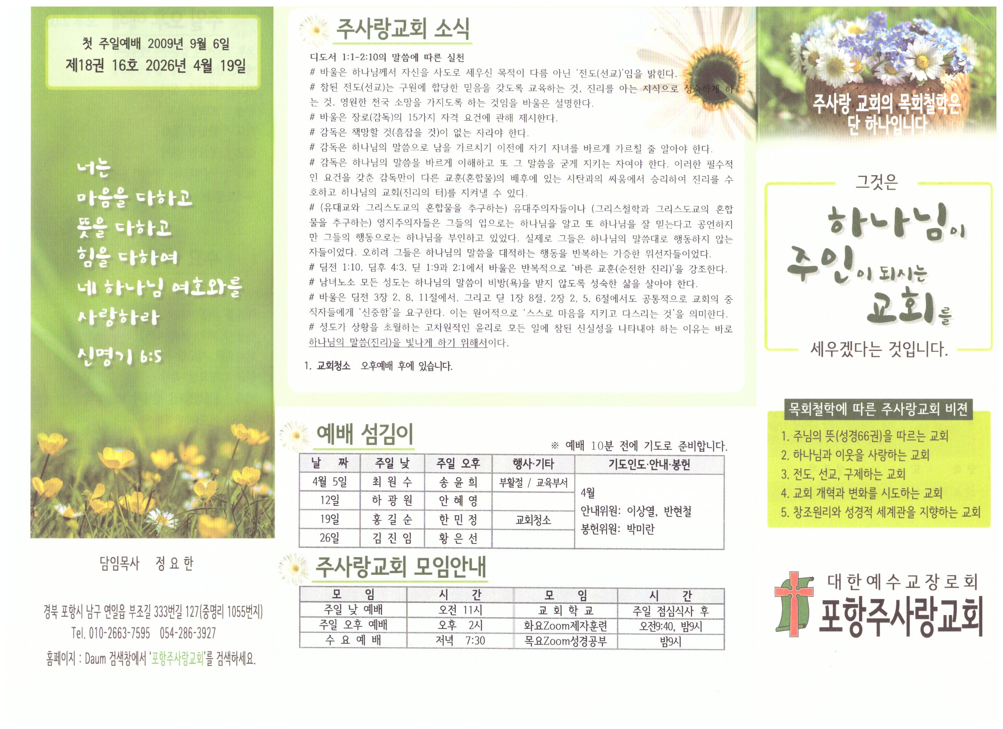 [주보] 2026년 4월 19일 작성자정요한목사|작성시간26.04.19|조회수18 목록 댓글 0 글자크기 작게가 글자크기 크게가 다음검색 현재 게시글 추가 기능 열기 북마크 신고 센터로 신고 댓글 댓글 0 댓글쓰기 답글쓰기 댓글 리스트