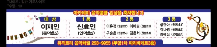 2016년 상반기 작성자뮤직트리|작성시간16.08.24|조회수48 목록 댓글 0 글자크기 작게가 글자크기 크게가 콩쿨 입상을 축하합니다~ 다음검색 현재 게시글 추가 기능 열기 북마크 공유하기 신고 센터로 신고 댓글 댓글 0 댓글쓰기 답글쓰기 댓글 리스트