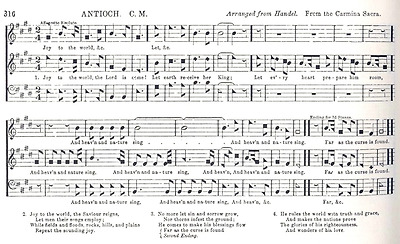 현재 통용되는 곡명「안디옥」'ANTIOCH' 이란 이름으로 미국 찬송가에 나타난 것은, 브래드버리(W. B. Bradbury)와 루트(G. Root)가 펴낸「음악 총서 숌」'The Shawm', A Library of Music, 1853'으로서 113쪽에 실려 있다. 위의 악보는 윌리엄 워커(William Walker, 1809-1875)가「도형악보 찬송가」'Shape-note Hymnal' 로 출판한, 미국 남부지방 민속찬송가 'Southern Harmony, and Musical Companion, 1854' 316쪽에 실린「기쁘다 구구 오셨네」이다.
