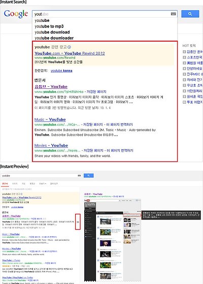 구글의 '순간 검색(Instant Search)'은 검색어를 입력하는 동시에 결과 화면이 나타납니다. 그렇기 때문에 타사의 방식처럼 검색어를 입력한 후 '엔터키' 혹은 '검색' 버튼을 누를 필요가 없습니다. 또한 각 검색 결과 옆에 위치한 Cue를 선택할 시 해당 웹페이지의 미리 보기 화면이 나타나는데 이를 '순간 미리보기(Instant Previews)'라고 합니다. 그리고 이 미리보기 화면에서 링크와 관련된 정보라고 판단되는 부분에 Highlight 표시(붉은색 박스)와 간단한 캡션이 제공됩니다. 구글이 야심차게 내놓은 순간 검색 서비스는 메인 화면을 되도록 빨리 벗어나게 하기 위한 구글의 의도가 잘 반영된 결과물이며, 실제로 검색에 소요되는 시간을 획기적으로 단축하는 데 기여했다고 보여집니다.