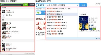 그 외에 뮤직 검색의 경우 아티스트, 앨범, 곡 3가지의 카테고리에 따른 추천 검색어를 표시합니다. 아티스트를 입력했지만 기대하지 않았던 관련 앨범 정보와 대표곡명을 함께 알려주기 때문에, 이용자 입장에서 얻는 컨텐츠를 생각한다면 역시 일반적인 자동 완성에서 한 단계 더 나아갔다고 볼 수 있습니다.