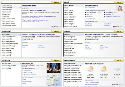 야후 역시 '서치 다이렉트'라는 검색 서비스를 제공하고 있습니다. 입력하지 않고 커서만 올려놓은 상태에서는 인기 검색어 랭킹이 나오다가(네이버에서는 최근 검색어가 보여지는데 반해), 입력하는 동시에 좌측에는 추천 검색어 영역, 우측에 현재 포커스된 추천 검색어에 대한 추천 결과가 나타납니다. 이 추천 결과에 외부 링크를 나열하기보다는 자체 컨텐츠에서 꺼낸 해답을 직접 제공하는 것이 서비스의 기본 아이디어입니다. 기존 결과 화면에서 일일이 링크를 클릭하여 결과를 얻는 것과는 다르게, 이용자가 원하는 정답을 직관적으로 제공한다는 점에서 타 검색엔진과는 차별화된 시도가 엿보입니다.