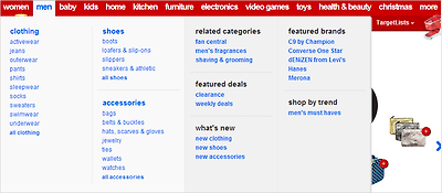 얼마 전 pxd에서 포스팅한 Global Navigation Bar 디자인에서도 메가 메뉴에 대한 소개한 바가 있듯이, 메가 메뉴란 글로벌 내비게이션 바(GNB)에 위치한 특정 메뉴에 마우스 롤오버 했을 시 나타나는 대형 메뉴를 말합니다. 일반적인 드롭다운 메뉴보다 훨씬 많은 메뉴를 표시할 수 있으며 메가 메뉴 안에서도 상세 분류를 할 수 있습니다. 카테고리를 명확하게 분류하여 메뉴를 찾기 쉽도록 기획해야 하며 주로 쇼핑몰 같은 대형 웹사이트에 적용됩니다.