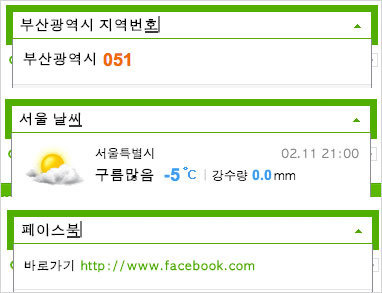 반면 네이버는 '정답형 자동 완성'기능을 제공하고 있습니다. 검색어를 입력했을 때 자동 완성 영역에 추천 검색어 뿐만 아니라 관련 결과값이 함께 나타나도록 만든 것인데요. 자동 완성과 순간 검색의 장점(검색 결과가 실시간으로 제공됨)을 혼합한 하이드리드 형태라고 볼 수 있겠네요. 예를 들어 사용자가 검색 필드에 '부산광역시 지역번호'를 입력할 시 자동 완성 영역에 실제 지역번호인 '051'이 제공됩니다. '페이스북'을 입력하면 바로가기 URL이 리스트에 제공됩니다. 아래 화살표 키를 눌러 포커스를 맞춘 후 Enter 키를 누르니 페이스북 홈으로 바로 이동합니다. 마우스를 사용하지 않고 원하는 경로로 바로 이동할 수 있는 점이 편리하게 느껴졌습니다. 모든 검색어에 적용되는 것은 아니고 현재는 시험적으로 국가, 지역번호, 공공기관, 학교 등과 같은 공적인 기관 혹은 로또 당첨 번호에 우선 적용하고 있다고 합니다.