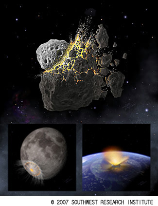 과학자들은 소행성 수천 개의 궤도를 컴퓨터 시뮬레이션을 통해 추적했으며, 관련 논문은 ‘네이처’에 실렸다. 1억 6천만 년 전 만들어진 소행성 조각들은 밥티스티나(Baptistina) 소행성군이라 불리는데, 여전히 지구에 위협이 되고 있다. 당시 우주 충돌 과정에서 최소 지름 1km의 소행성 1천개가 만들어졌다. (사진: 사우스웨스트연구소의 보도자료) 2007.09.06