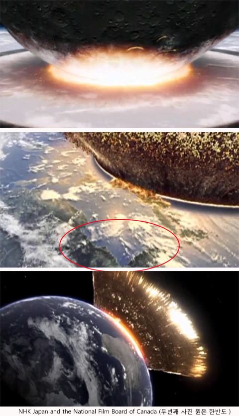 전문가들에 따르면 지구에는 과거 이런 소행성과의 충돌이 무려 6차례나 있었다고. 이 충격적인 과정을 시각적으로 재현한 이번 영상은 지구의 46억 년 역사를 다룬 5부작 다큐멘터리(NHK, 캐나다 국립영화위원회 공동제작) 중 1부에 포함되어 있다. 2010.09.10