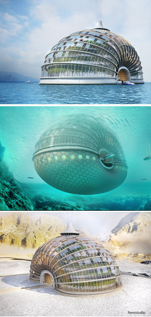 지구온난화에 따른 급격한 기후변화에 적극적으로 대응할 수 있도록 설계된 호텔이 있다. 러시아 건축사무소 레미스튜디오가 설계한 ‘방주’라는 이름의 이 호텔은 바로 물 위에 둥둥 뜨는 호텔. 대홍수가 나도, 해수면 상승으로 육지가 물에 잠겨도 물 위에서 자율적으로 생활할 수 있도록 디자인 된 건축 구조물이다.
