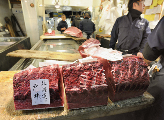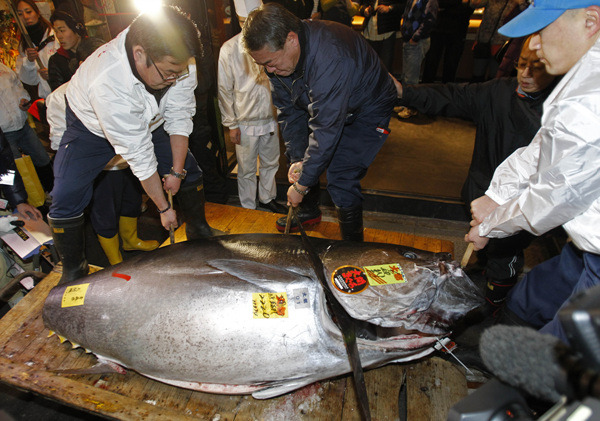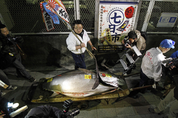 5일 새벽 일본 도쿄의 최대 수산물도매시장인 쓰키지(築地) 어시장에서 시행된 참치 경매에서 홋카이도(北海道)산 참다랑어(참치:일본에서는 '구로 마구로') 한 마리가 사상 최고치인 3천249만엔(약 4억4천만원)에 팔렸다. 이는 ㎏당 경매가가 9만5천엔(약 128만원)으로 일본에서 기록이 남아 있는 1999년 이후 참다랑어 경매가로는 최고치다. 2011-01-05
