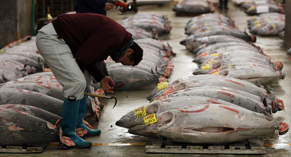 참치는 어족보호 등의 이유로 국제적으로 어획량을 규제하고 있으나 중국 등 아시아 지역에서 수요가 늘면서 경매가격은 상승하는 추세다. 도쿄 쓰키지 어시장은 일본 최대의 수산물 도매시장으로 국내외에서 공수된 고급 참치가 경매되고 있다. /AP 2013.01.05