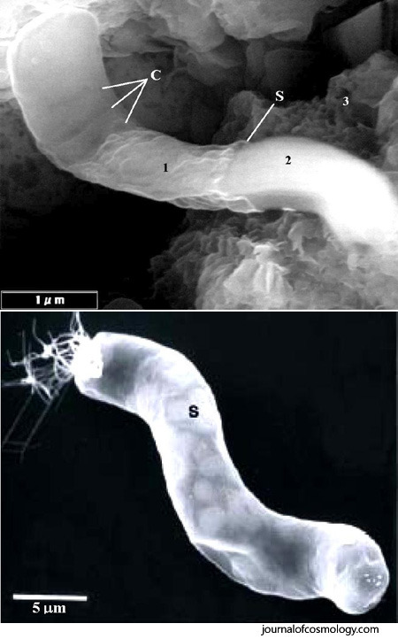 (위는 운석에서 발견되었다는 외계 생명체, 아래는 지구의 박테리아)
