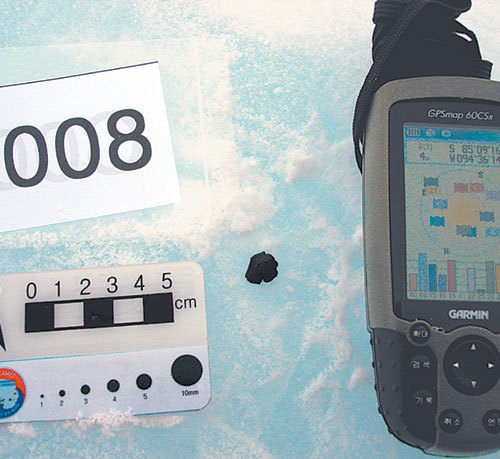 중앙에 까만 점처럼 보이는 돌은 1g짜리 운석이다. 남극운석탐사대가 발견한 운석 중 가장 작다.