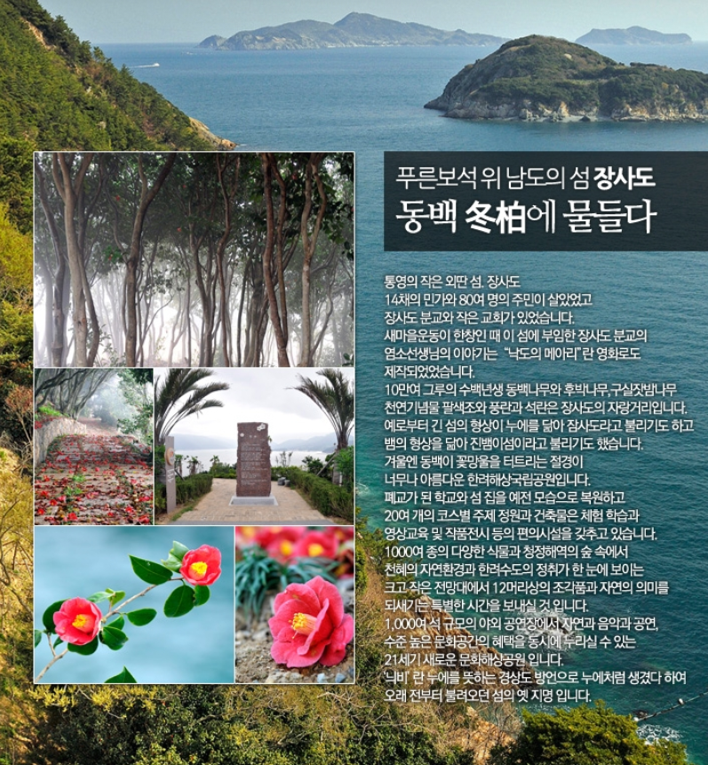| 진행일정 : 버스진행 [탑승지 말머리선택] 1일차 거제도착 점심식사 2시반 배로 장사도에 들어 갑니다. 장사도에는 10만여 그루의 동백나무, 후박나무, 구실잣밤나무와 천연기념물 팔색조, 동박새와 석란등이 있다. 무인도가 되기 전에 14가구 80여 명의 주민이 거주했다. 섬 모양이 누에를 닮아 잠사도 혹은 누에섬이라 불렸다. 장사도는 드라마 ‘별에서 온 그대’의 촬영지로 유명해졌다. 드라마 속 주인공이 사랑을 확인했던 동백나무 길 전체에 동백꽃이 가득 피어있어 관람코스를 따라 걷다 보면 잔잔한 남해 바다를 여유롭게 감상할 수 있는 전망대가 나온다. 전망대 외에도 장사도에는 온실, 섬아기집, 공연장 등 이색적인 공간들이 마련돼 있다. 배를타고 내리는 근포항 부근에 근포땅굴 탐방 저구리 근포마을 바닷가의 중생대 백악기 거제 화강암에 굴착된 땅굴이다. 1941년 일본군이 포진지 구축을 위해 건설했으며 최근에는 땅굴 앞에서 찍은 사진이 SNS를 통해 소개되어 포토존으로 각광받고 있다. 저녁식사 취침 [바람의언덕 숙소] 2일차 신선도 쉬어가는 언제가도 좋은곳 신선대와 남해 바다의 아름다움이 가득한 거제도의 풍경 중에서도 가장 뛰어난 여덟 곳 거제팔경중의 하나다 바람의언덕 새벽트레킹!! 원래의 지명은 ‘띠밭늘’로 불렸으며, 2002년부터 ‘바람의 언덕’으로 바뀌어 불리고 있다. 언덕에서 바다를 바라보면 한 없이 넓고, 고즈넉하며, 시원한 바람이 상쾌함을 선사한다. 여유롭게 아침식사 [아침은 숙소에서 가볍게 합니다.] 거대한 돔 형식의 거제 식물원의 초록한 봄기운 우리나라 최대 규모 식물원이다. 돔 내부에는 300여 종 1만 주의 열대수목이 있으며, 내부에는 석부작 초화원, 석부작 계곡, 포토존, 선인장원, 흑판수, 빛의 동굴 등 다양한 볼거리를 제공한다. 통영의 동피랑 벽화마을을 들립니다. 동피랑은 통영항을 내려다보는 언덕 위에 자리잡고 있어 벽화와 함께 아름다운 항구 풍경을 감상할 수 있다. 동포루의 조망은 다른 벽화마을과는 차별화된 매력으로 통영의 가장 아름다운 일몰을 감상할 수 있는 전망대이기도 하다. 또한 통영의 풍경, 문화예술, 바다를 주제로 한 벽화들이 많아 지역 문화와 삶을 느낄 수 있으며 전통시장인 중앙시장과 인접해있어 통영의 맛도 즐길 수 있다. 통영중앙시장에서 점심식사 [회한사라 좋겠네요] 서울로~ 일정 : [상황에 따라 코스는 달라 질수도 있습니다] |