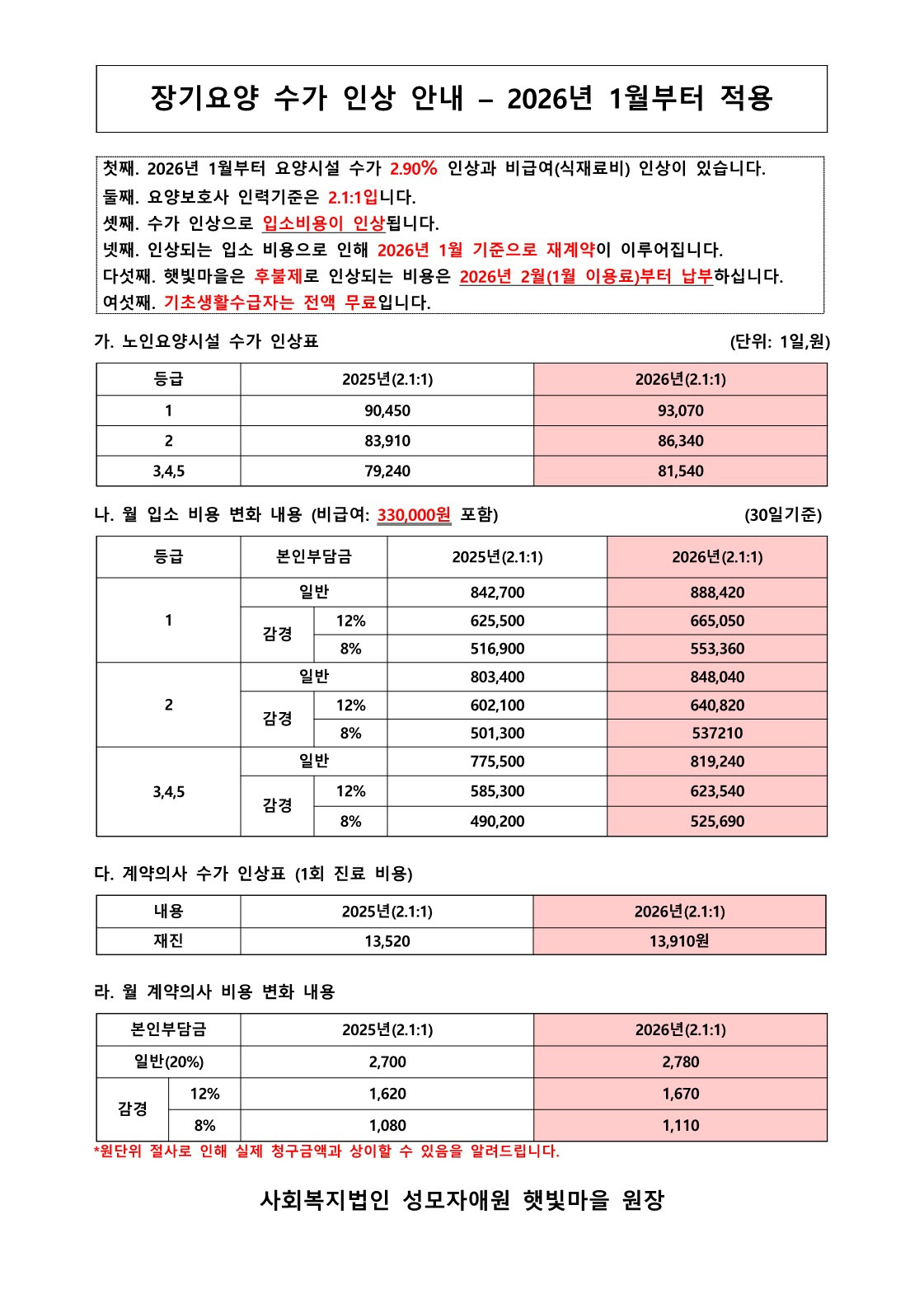 2026년 수가 인상에 따른 수가 안내 작성자햇빛마을|작성시간25.12.15|조회수8 목록 댓글 0 글자크기 작게가 글자크기 크게가 다음검색 현재 게시글 추가 기능 열기 북마크 공유하기 신고 센터로 신고 댓글 댓글 0 댓글쓰기 답글쓰기 댓글 리스트