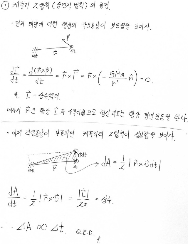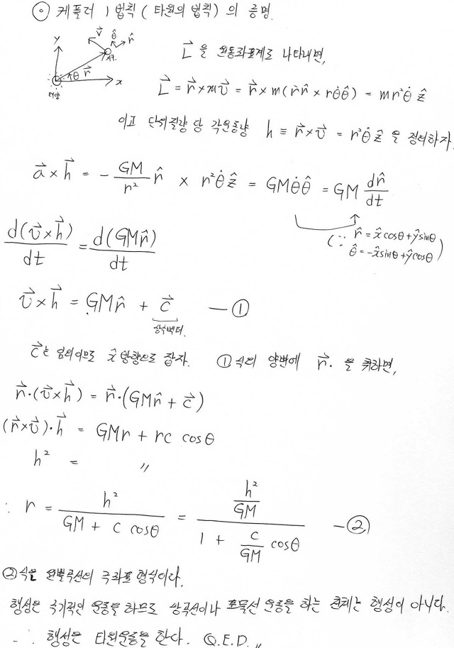 증명을 이해할려면 대학교 1학년때 배우는 미분적분학 책에 나오는 벡터해석파트를 공부해야하는데...(또는 수리물리의 벡터해석 파트)... 그냥 알고 있다고 가정하고 증명하겠습니다...-_-aa 이거 설명할려면 케플러 법칙증명이 아닌 벡터해석 공부가 되므로...ㄱ-..