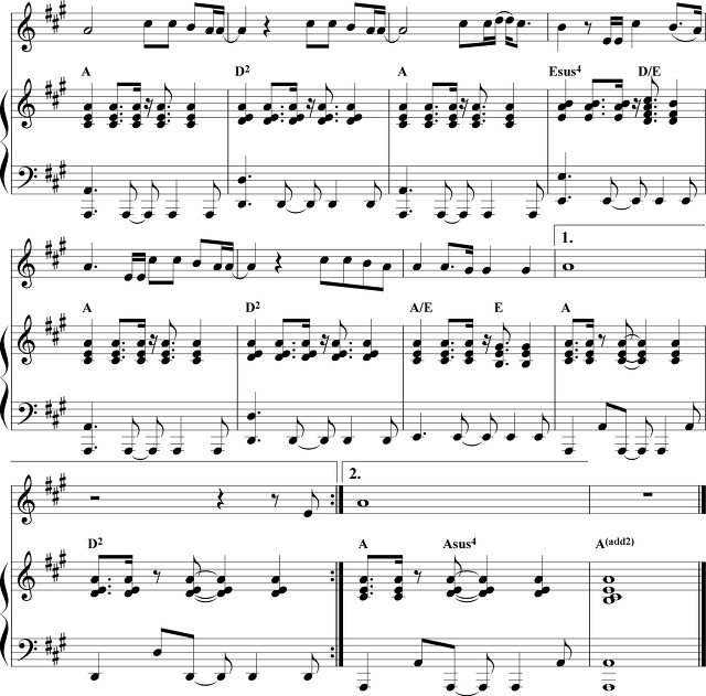 후렴의 멜로디는 당김음이 없고, 거의 정박에 떨어지는 리듬이기 때문에,