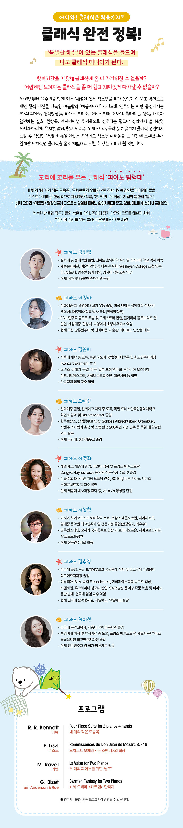 베넷의 ‘네 개의 작은 모음곡’, 리스트 오페라 <돈 조반니> 오페라 속 명곡 모음 ‘돈 조반니의 회상’, 라벨의 몽환적 ‘왈츠’ 그리고 비제 오페라 <카르멘> 비제 <카르멘> 속 장면들이 떠오르는 강렬한 피아노 환타지까지! 광고, 영화, 애니메이션에서 들어봤던 익숙한 선율과, 작곡가들의 숨은 이야기, 곡마다 담긴 감정의 코드를 해설과 함께 “꼬리에 꼬리를 무는 클래식”으로 따라가 보세요.