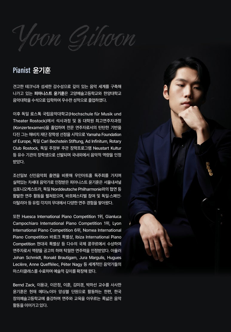 견고한 테크닉과 섬세한 감수성으로 깊이 있는 음악 세계를 구축해 나가고 있는 피아니스트 윤기훈은 고양예술고등학교와 한양대학교 음악대학을 수석으로 입학하여 우수한 성적으로 졸업하였다.