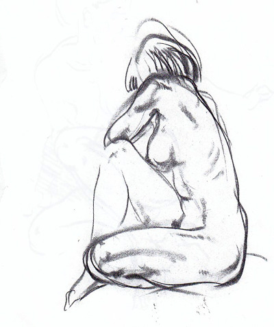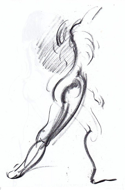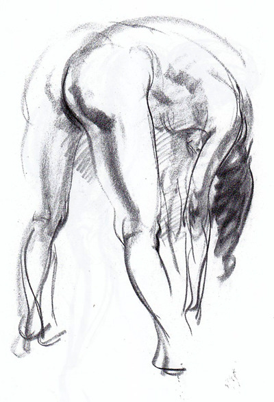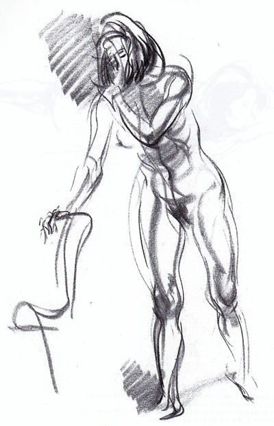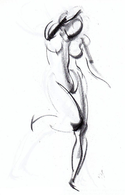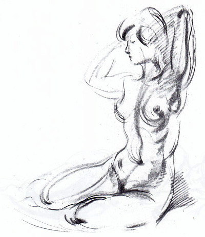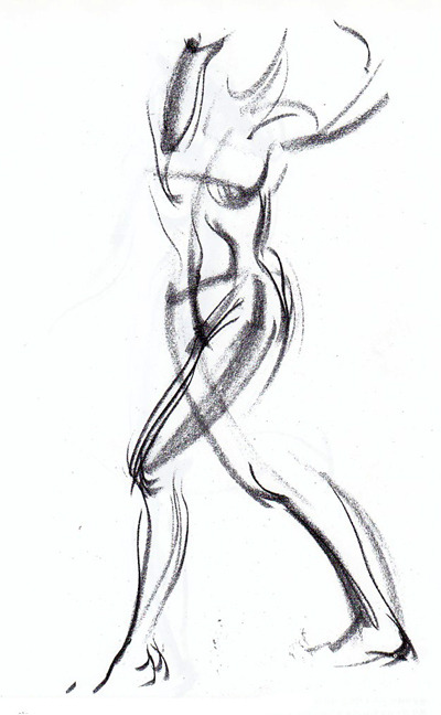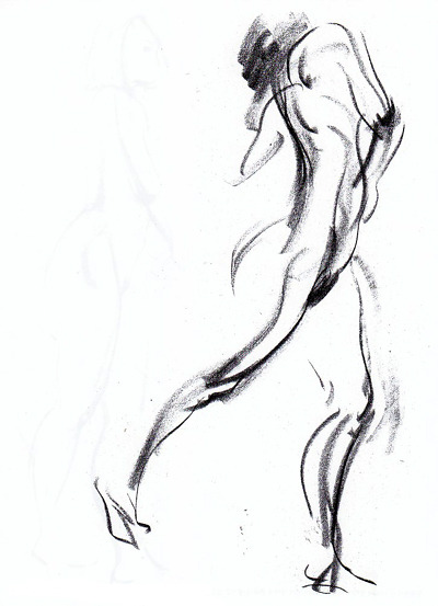 1분이나 2분 제스처 드로잉에서 경험하지 못한 부분들이 문득 더 감지되는 것을 경험하게 되리라. 어깨와 가슴 그리고 하복부의 윤곽선은 물론 두 무릎의 윤곽도 선명하게 처리되었음을 주의깊게 관찰해보자. 제스처 드로잉에서 가장 중요하고 또 기본이 되는 것은 우선 부담감과 강박관념으로부터 벗어나는 일이다. "잘 그려야 겠다." 또는 "한 선으로 그려 버리겠다." 등의 욕심이나 결심은 그것을 가지는 순간부터 우리의 감각을 둔화시켜 버린다. 이중 삼중...십중의 선까지 겹친다 하더라도 개의치 말고 자유롭게 그려나가자.