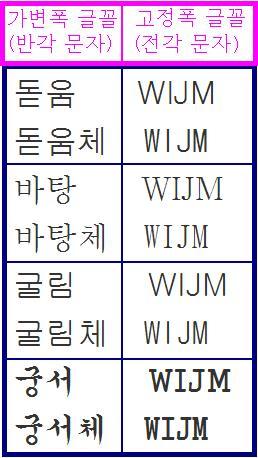 1). 가변폭 글꼴(돋움, 바탕, 굴림, 궁서)