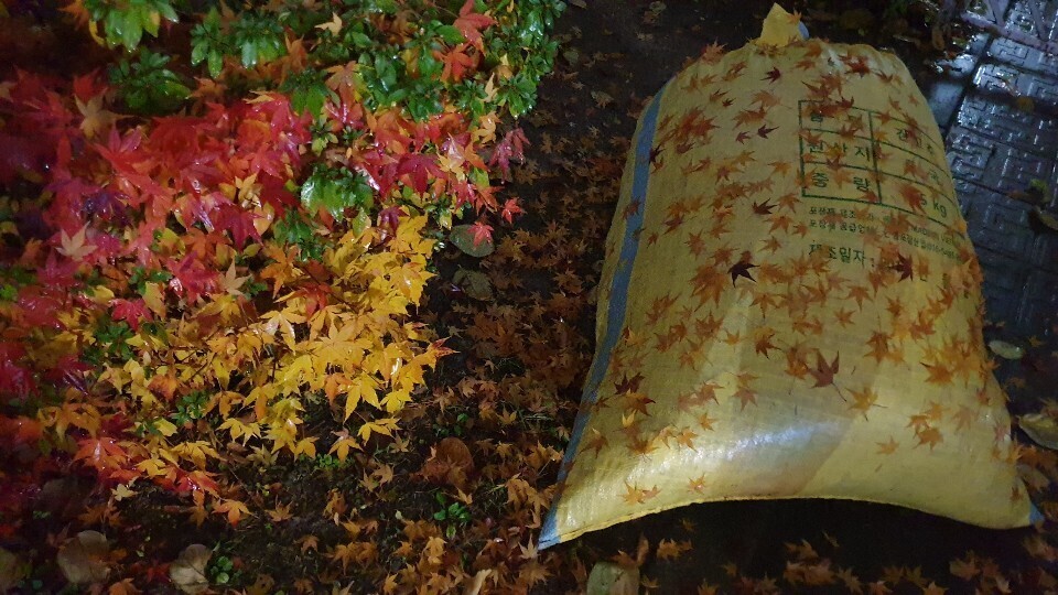게다가 비가 오니 낙엽 담은 부대자루마다