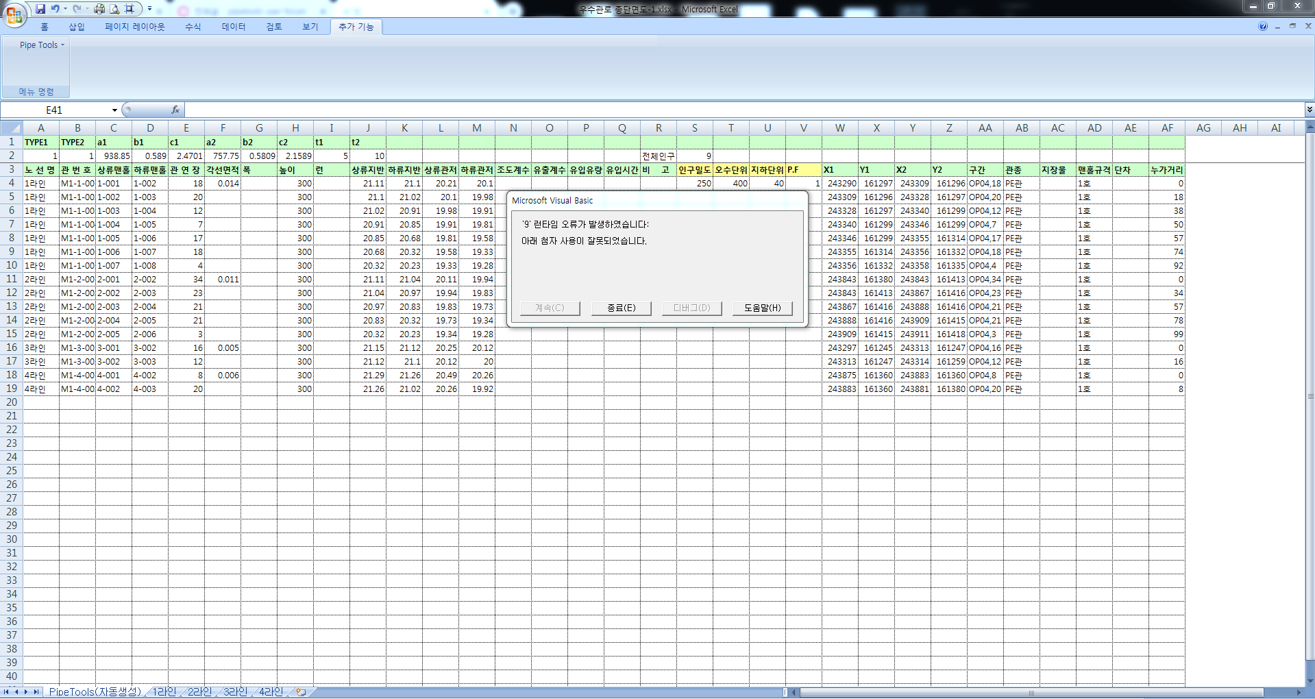 엑셀프로그램에서 추가기능 - pipetools - 파일생성 - 수리계산데이터 클릭해서