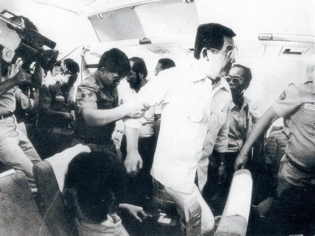 비행기에서 내리는 니노이 아키노. 군인들이 호송하고 외신기자들은 따라 내리지 못하도록 하였다.