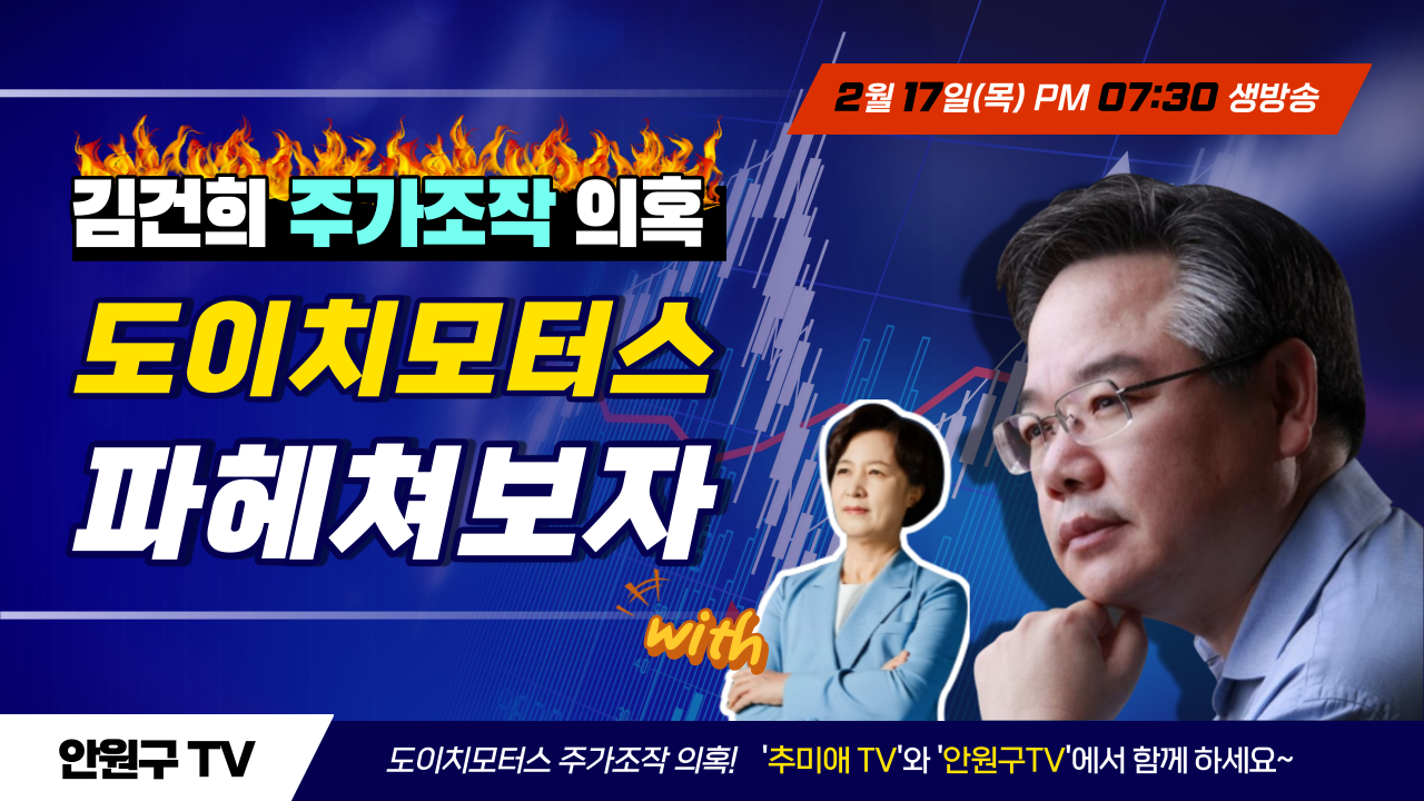 오늘 (2월 17일, 목요일) 저녁 7:30 에 추미애 전 장관님과 함께 하는 안원구 TV가 라이브가 방송됩니다.