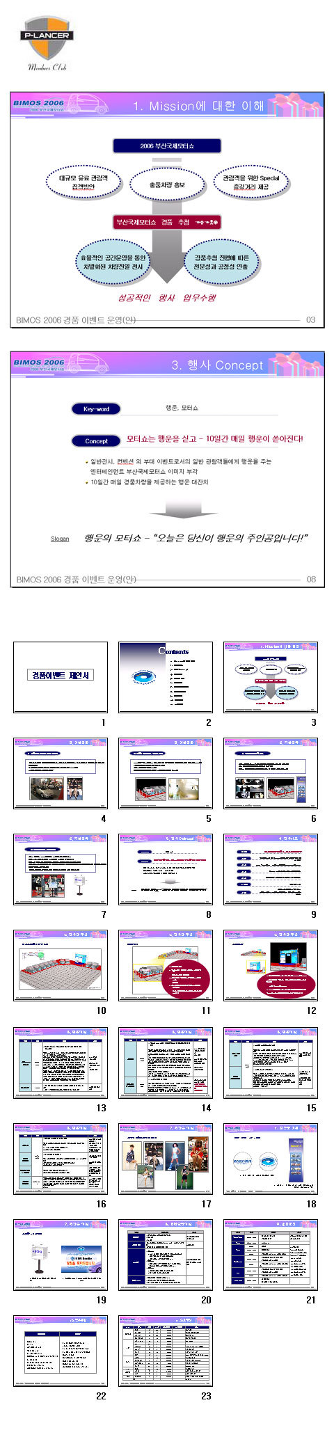 | 1. Mission에 대한 이해 2. 기본전략 3. 행사 concept 4. 행사개요 5. 행사장 구성 6. 연출계획 7. 장치 제작물계획 8. 인력운영계획 9. 추진일정 10. 업무분장 11. 소요예산 |