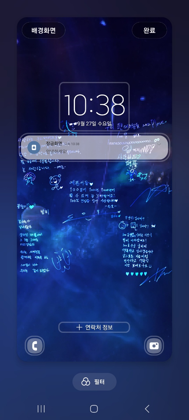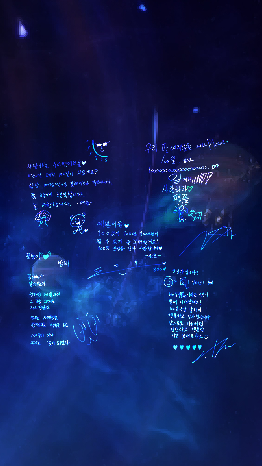 이건 멤버들이 100일 기념으로 작성해준 편지 내용이 귀여워서 넣어봤습니다(원본 글씨 색상을 반전시켜서 적용했는데 배경화면으로 사용하기에는 눈이 조금 아플 수 있습니다.)