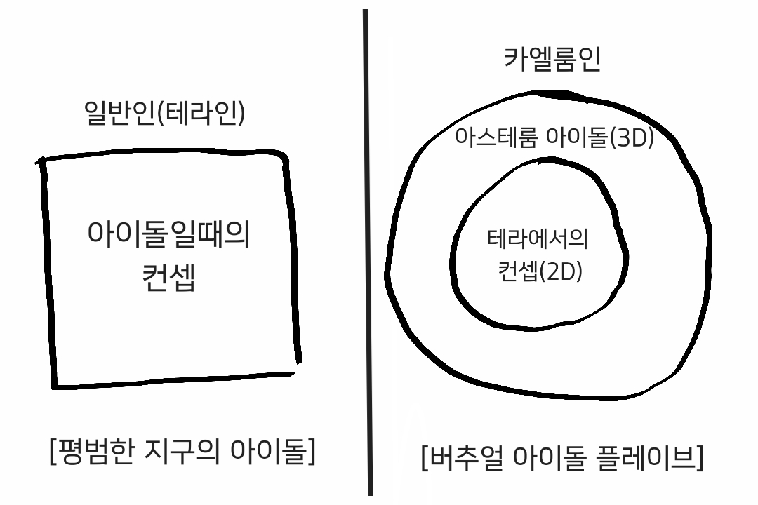아이돌이 되기 위해서 카엘룸과 테라를 잇는 아스테룸이라는 공간이 필요했어요. 그 과정을 거쳐 아이돌로 데뷔한 후에는 아이돌로서 부여받은 컨셉이 따로 있게되는겁니다.