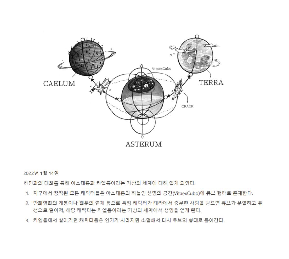 * 기다릴게 뮤비, 큐알코드 떡밥, 해석가능해진 아스테룸어, 여섯 번째 여름 뮤비를 바탕으로 분석 및 추리한 세계관입니다.