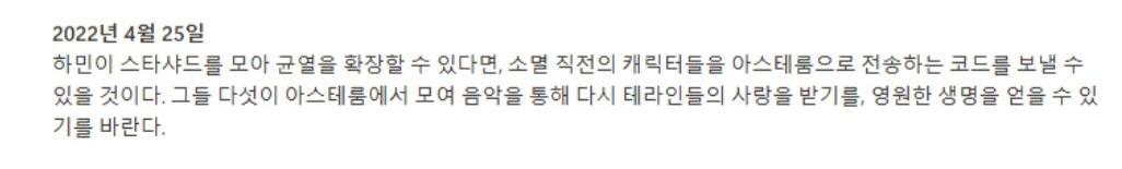 하민이는 '스타샤드(Star shard)'를 모아 균열을 확장시킬 수 있었고, 개발자는 이러한 하민이를 도와 멤버들을 아스테룸으로 전송하는데에 성공하게됩니다.