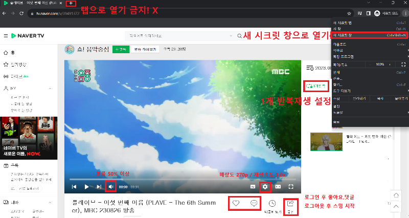 - 화질 270p / 영상 볼륨 50% 이상 / 재생속도 1.0x / 1개 반복 설정 후 스트리밍
