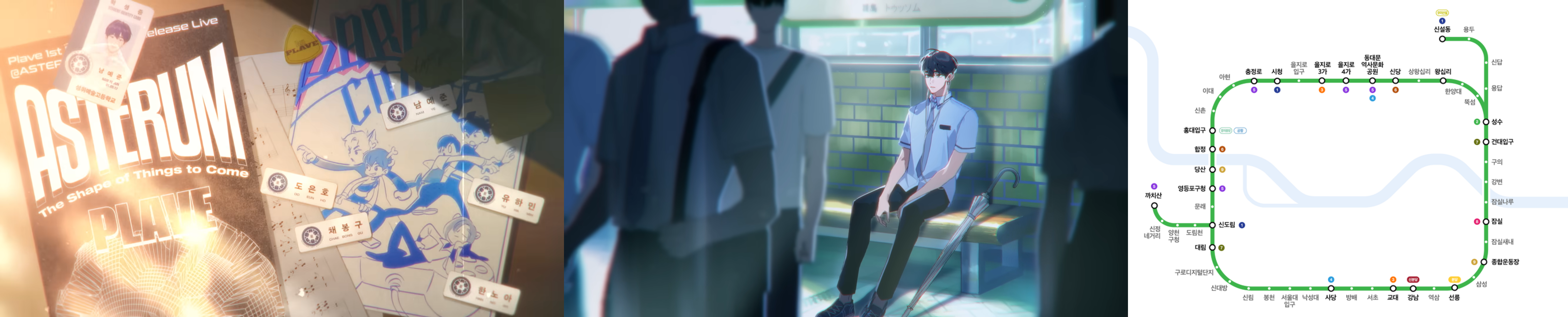 세번째는 만남의 거부입니다. 일전에 플리님께 댓글로 서로 반대 방향을 보는 것은 만남의 기본 조건이라고 말씀했던 적이 있는데, 행인과 예준을 보면 서로 반대 방향으로 가고 있습니다. 예준은 그들과 만남을 가질 수 있었지만 지나쳤습니다. 표정을 보니 관심도 없군요. 지하철은 시공간을 뜻하지만 우연한 만남/재회의 공간이기도 합니다. 예준이 거기서 홀로 빠져나왔다는 것은 그곳의 모든 만남을 거부하는 것이고, 결국 이건 플레이브에 대한 지향으로 풀이됩니다. 이후에 이어질 행동은 예준 나름대로 플레이브와 다시 만나기 위한 노력이겠죠.