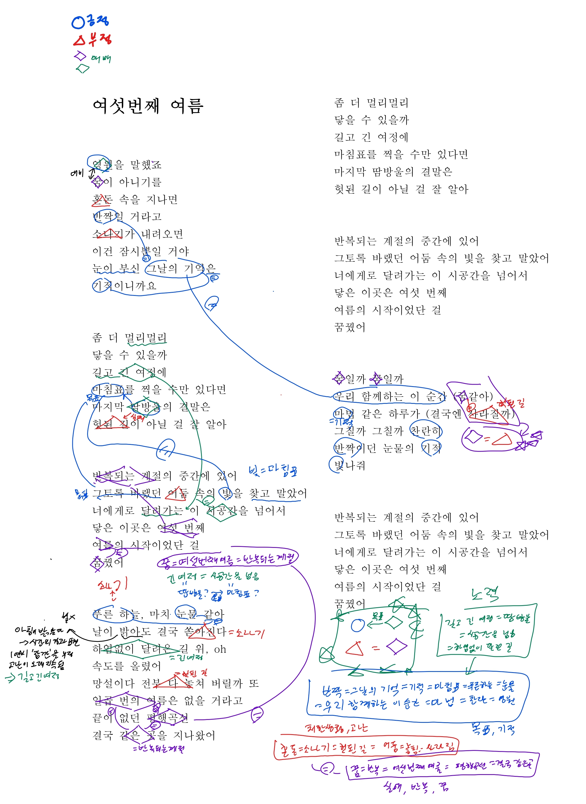 이전에 여섯번째 여름 가사를 해석을 했지만... 제 손글씨가 악필이라 못 알아보겠다는 피드백(from. 호적메이트)을 받아 아래로 가볍게 요약 설명을 해 드릴게요.