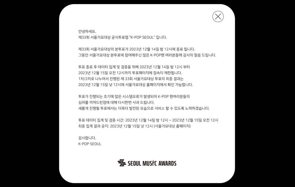 작성자율무무 작성시간 23.12.15 근데 저게 총투표결과발표인지 시상자발표인지 헷갈리더라구요. 시상자는 시상식에서만 발표할것같아서...서가대는 작년에 신인상세팀을 줬다고하니 저희 기대해봐도 될듯합니다!