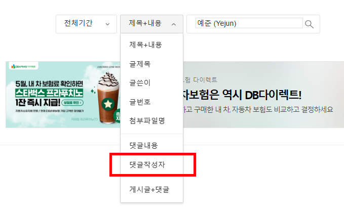 제목+내용을 클릭해서 댓글작성자로 바꿔주시고, 검색하고 싶은 멤버의 이름을 괄호까지 토씨 하나 틀리지 않게 적어 넣고 검색해줍니다.