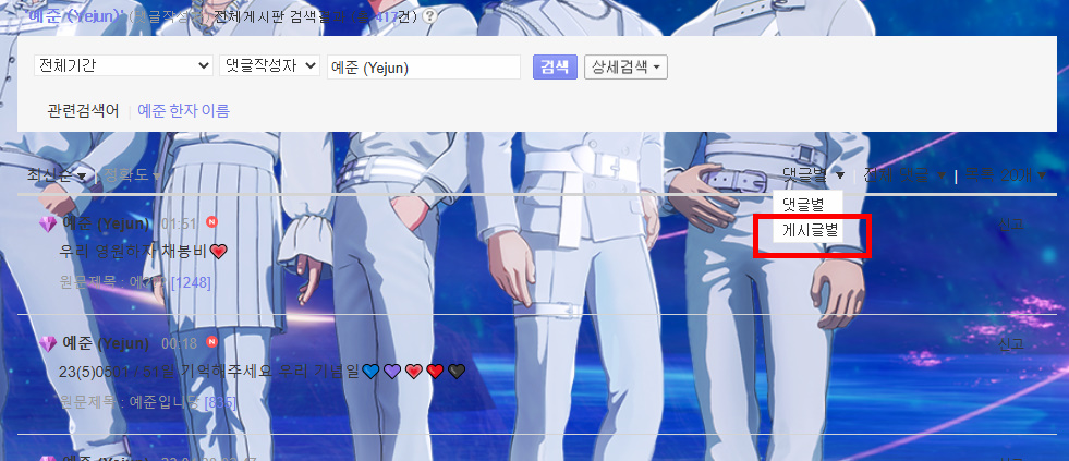 댓글별 옆의 삼각형을 눌러 게시글별로 바꿔주십니다!