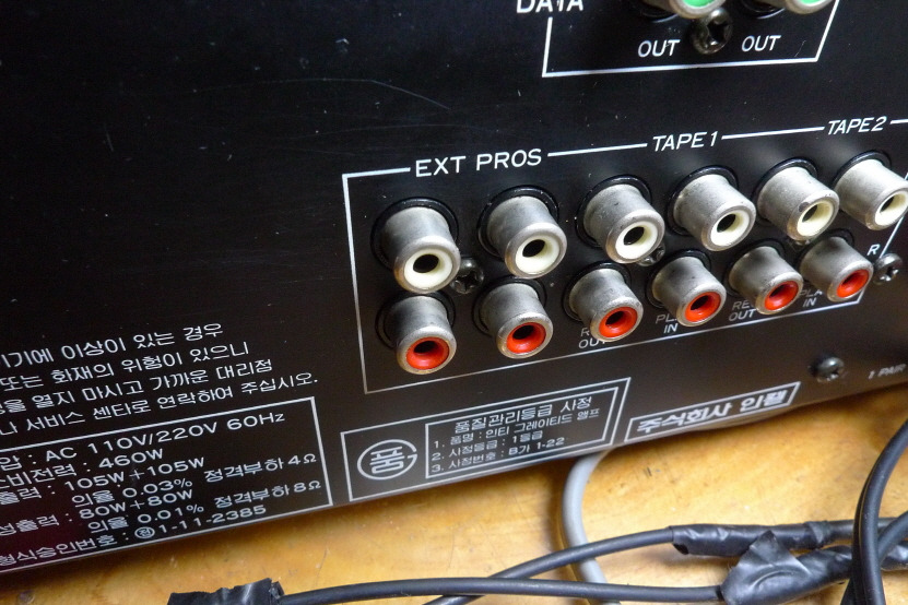 뒷면에 외부 단자,EXT PROS 단자 끼리 인터선으로 연결해주어야 소리가 납니다.
