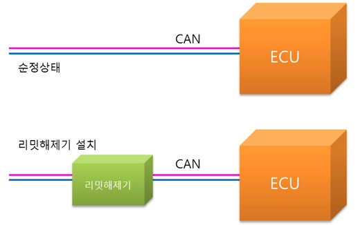 ECU로 들어가는 CAN-BUS를 끊고, 중간에 리밋해제기를 설치합니다.