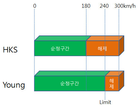 - HKS 제품에 비해 영모터스 제품이 순정 구간을 넓게 사용 (180~240 구간)