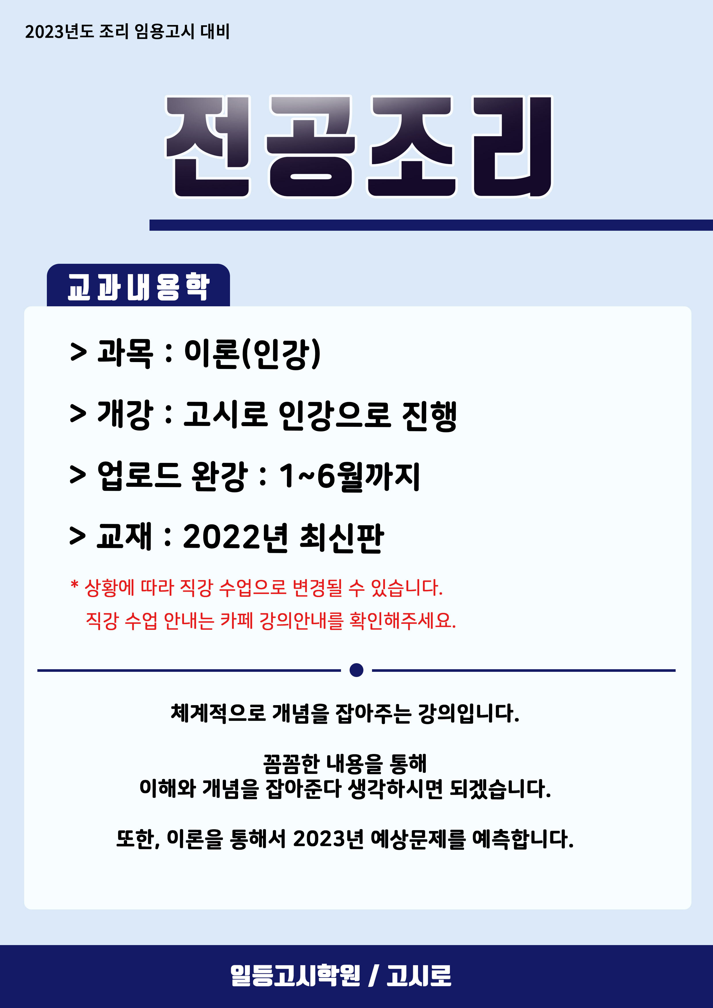 2023년 대비 교과내용학 조리이론 안내 작성자조리 조교|작성시간21.12.05|조회수163 목록 댓글 0 글자크기 작게가 글자크기 크게가 추가 문의 ▶ http://pf.kakao.com/_Urqub일등고시학원_GOSIRO 임용임용의 메카, 일등고시학원입니다.pf.kakao.com 다음검색 현재 게시글 추가 기능 열기 북마크 공유하기 신고 센터로 신고 댓글 댓글 0 댓글쓰기 답글쓰기 댓글 리스트