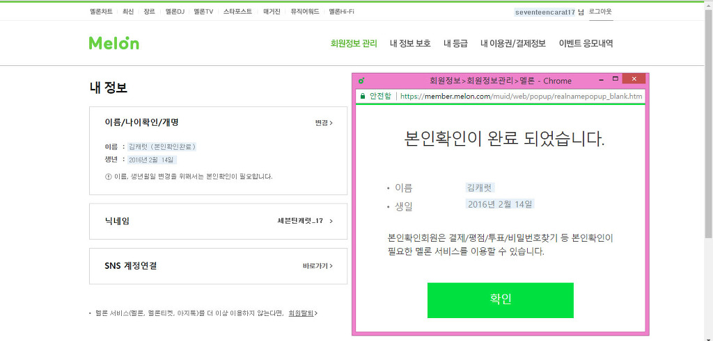 4) 본인 인증이 완료된 이름, 생년월일이 포함된 멜론 본인 정보 내역
