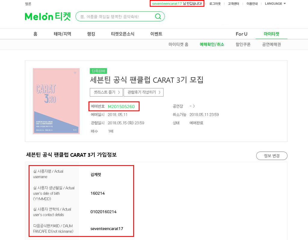 (캐럿 3기 회원카드 또는 예매 상세 내역서 또는 멜론 티켓 어플 마이티켓 확인, 모바일 캡쳐 이미지 불가, 부가 정보에 작성하신 실 사용자 정보와 공개방송 신청 및 참여자의 정보가 동일해야 합니다.)