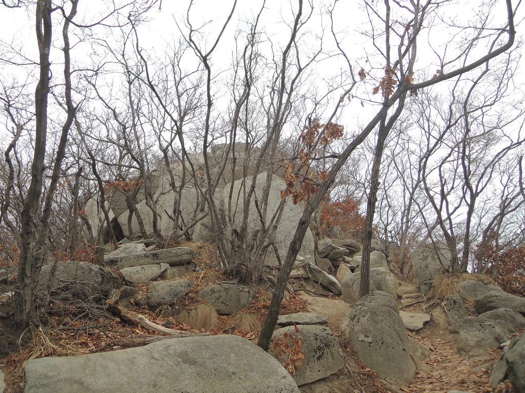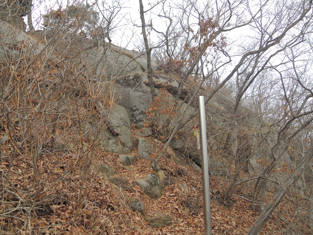 ▲ 등산로 종점 안내판에서 22분 후, 이정표 없는 스텐 봉우리가 있는데, 종주 코스는 왼쪽 바위 위로 연결됩니다.