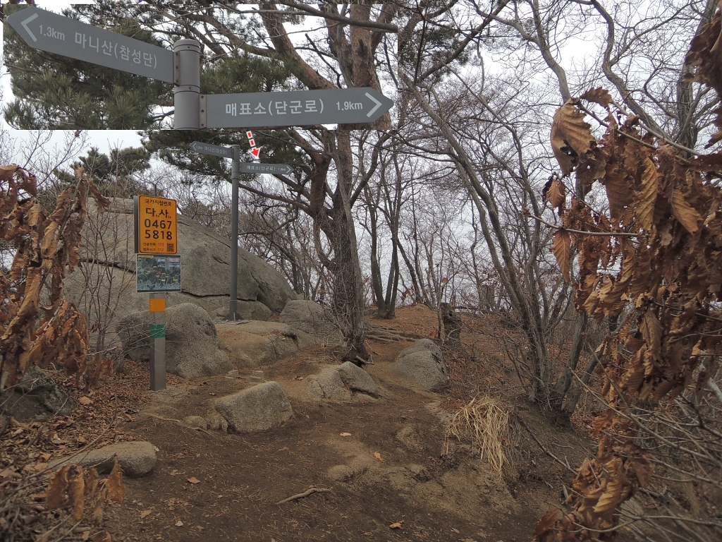 ▲ 마니산 정상에서 27분 후, 정규 등산로는 오른쪽 단군로 방향으로 내려가는데, 종주 코스는 이곳에서 직진합니다.